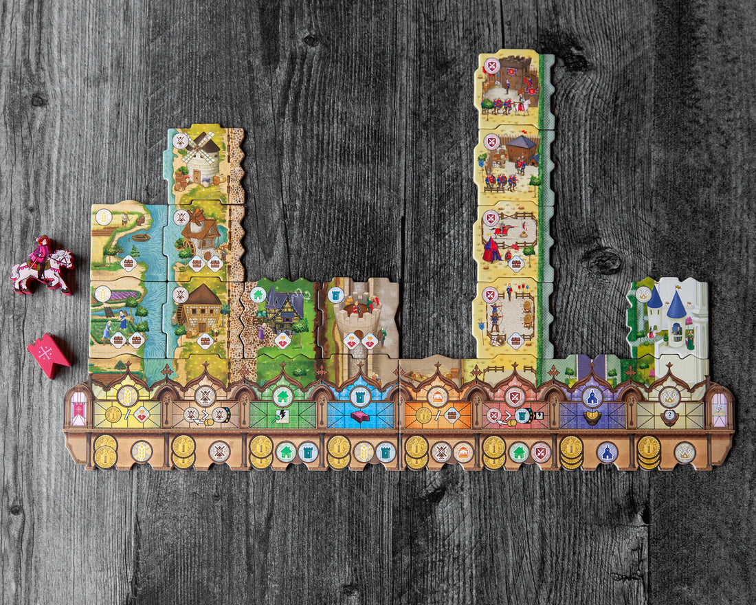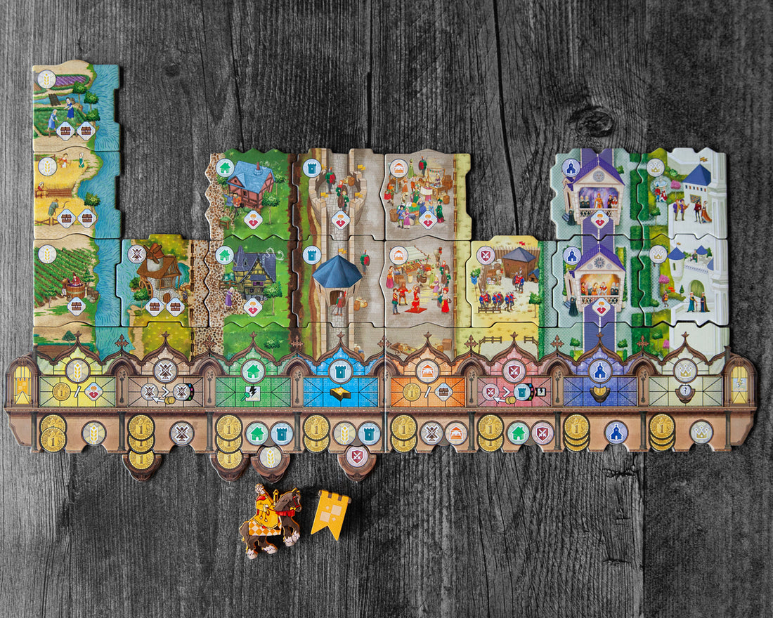 The future of your fiefdom is in your hands. One tile at a time, develop your lands in your image and become the most influential lord in the kingdom. Place your Lord to select tiles while planning for your next turns, add the Plot tiles to your Fiefdom to trigger powers and develop harmoniously to maximize your score! You are the head of a fiefdom and its future is in your hands. Will you develop agriculture with fields and mills? Or will you become a pious church-builder or prefer to feast in your sumptuous palaces? Develop your lands in your image and become the most influential lord in the kingdom. The game is played over 16 rounds. In turn, each player selects a Plot tile from the current row, by placing his Lord piece on it. Following the order of the row, they add it to their Fiefdom, triggering its powers and scoring, depending on its type. The 8 different tiles representing the elements of the medieval city: field, farm, village, rampart, market, barracks, church and palace. Each tile has its own scoring system, often dependent on other tiles, and some of them trigger interactive effects (attacking other players, reserving future tiles) or enable combos (to increase income).Once each player has collected their 16th tile, the player with the most money wins the game.