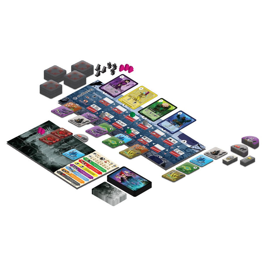 In SiliconVania, players bid on building tiles and multi-use specialists that provide either one-time bonuses, or end-of-game scoring. Players take the building tiles they win, and place them in their 4x4 city grids, juggling different scoring opportunities, and collecting vampire and pet meeples that are looking for places to live!
