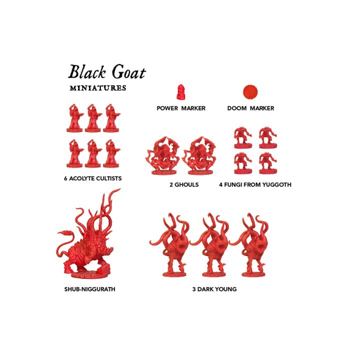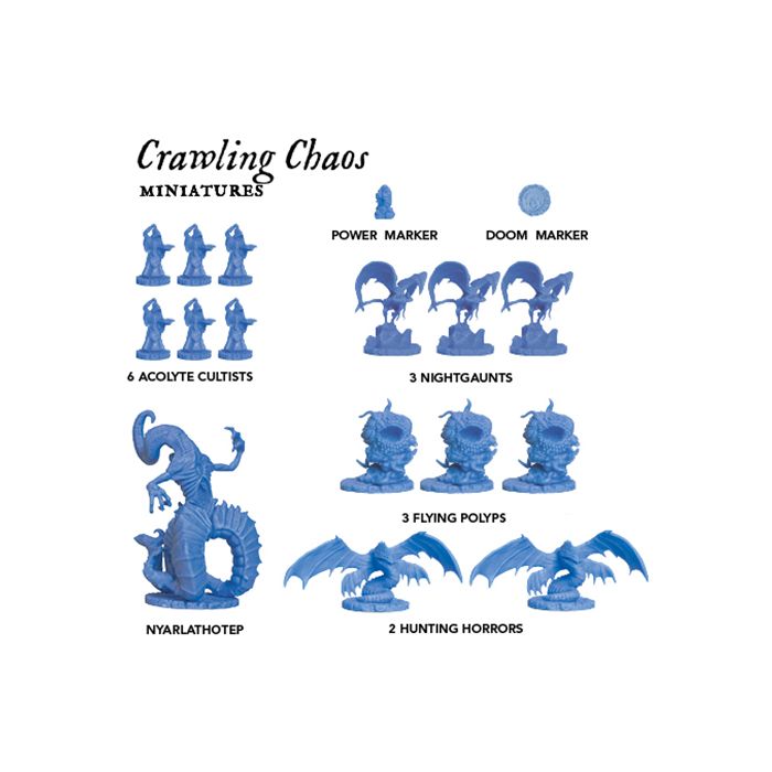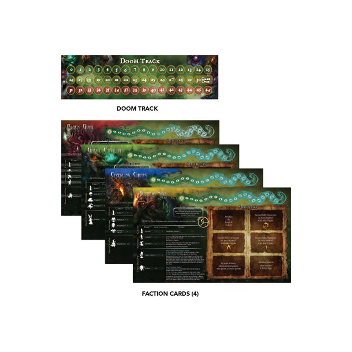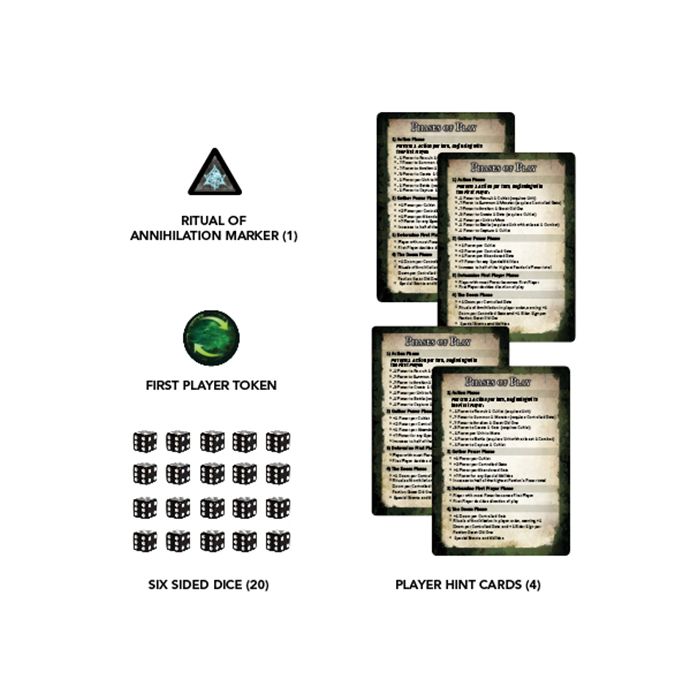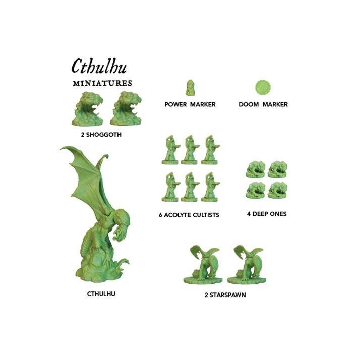 The game has a huge map of Earth to fight over, and 72 high-quality figures, all drawn from the dread Cthulhu Mythos, including Cthulhu himself, Cultists, Shoggoths, and many other horrors. Miniatures are 28mm scale and compatible with other table top miniature games.