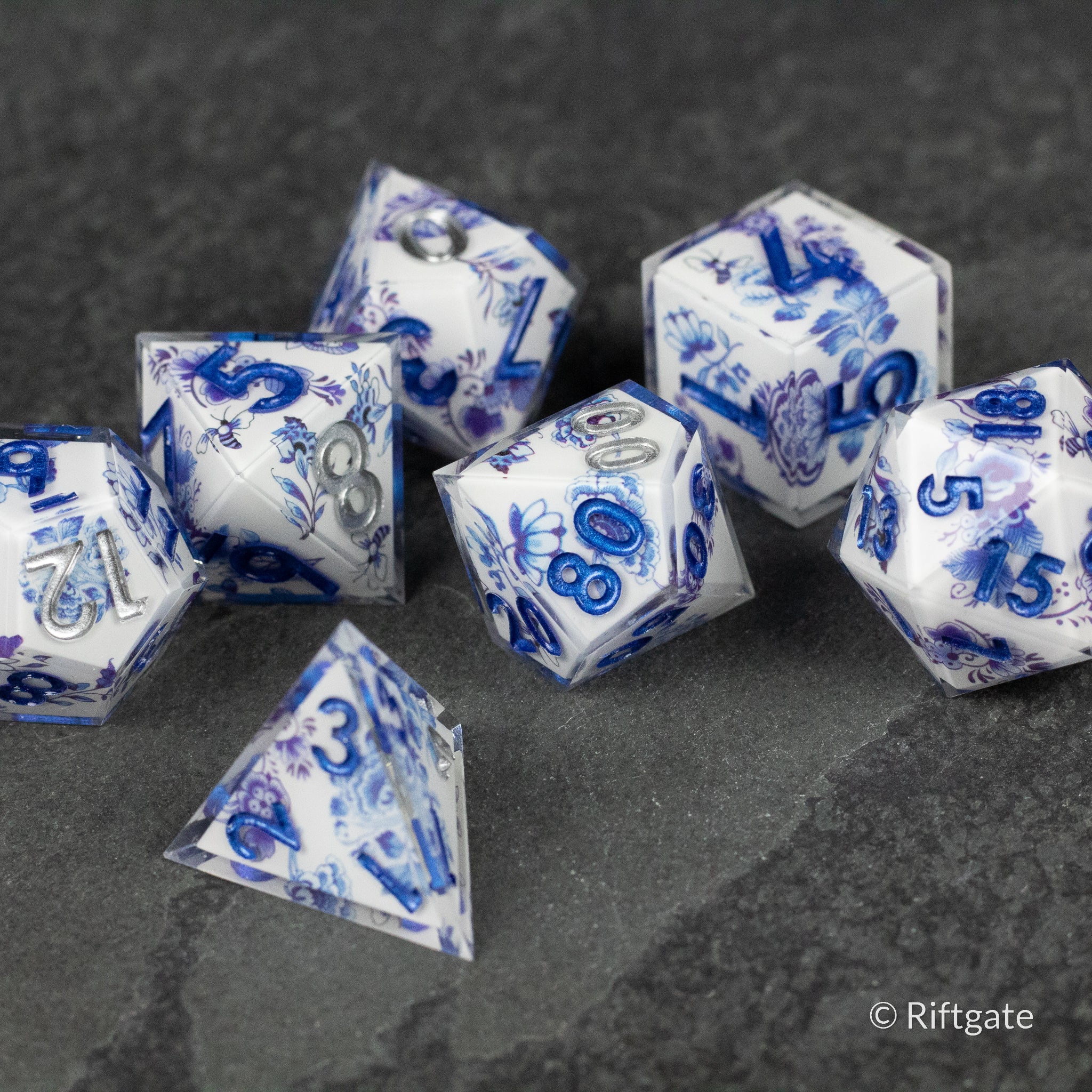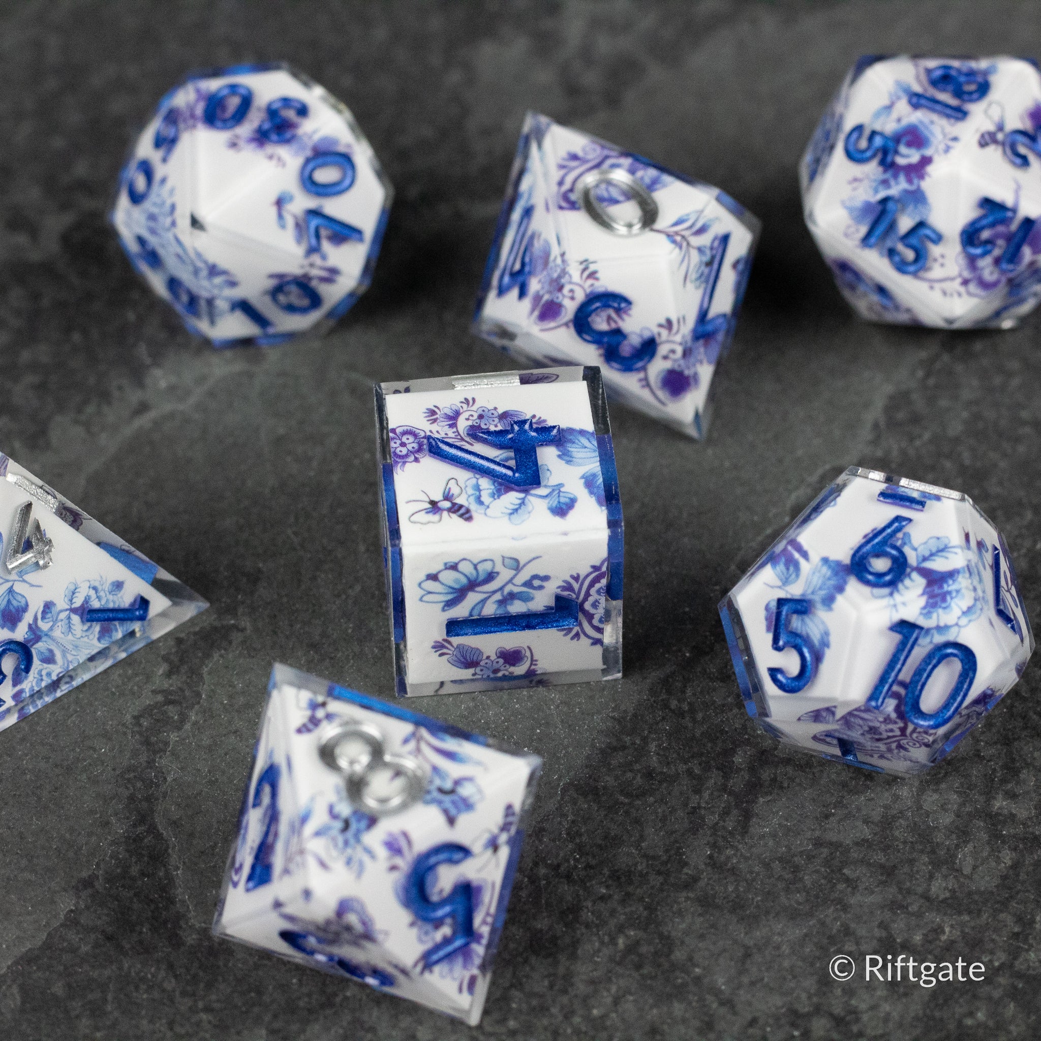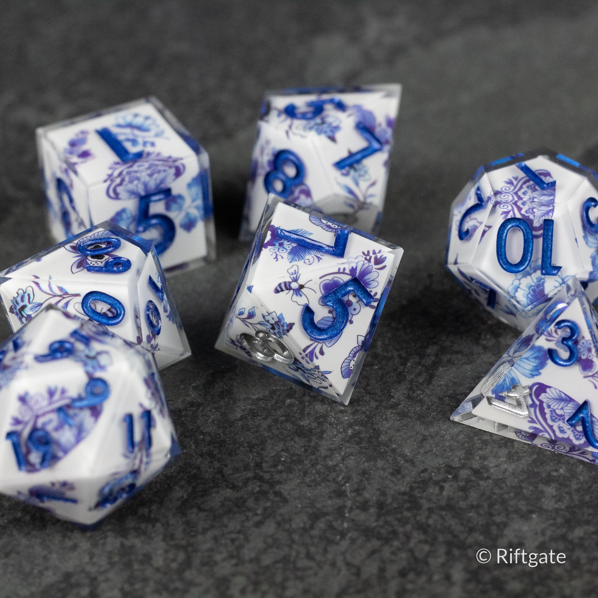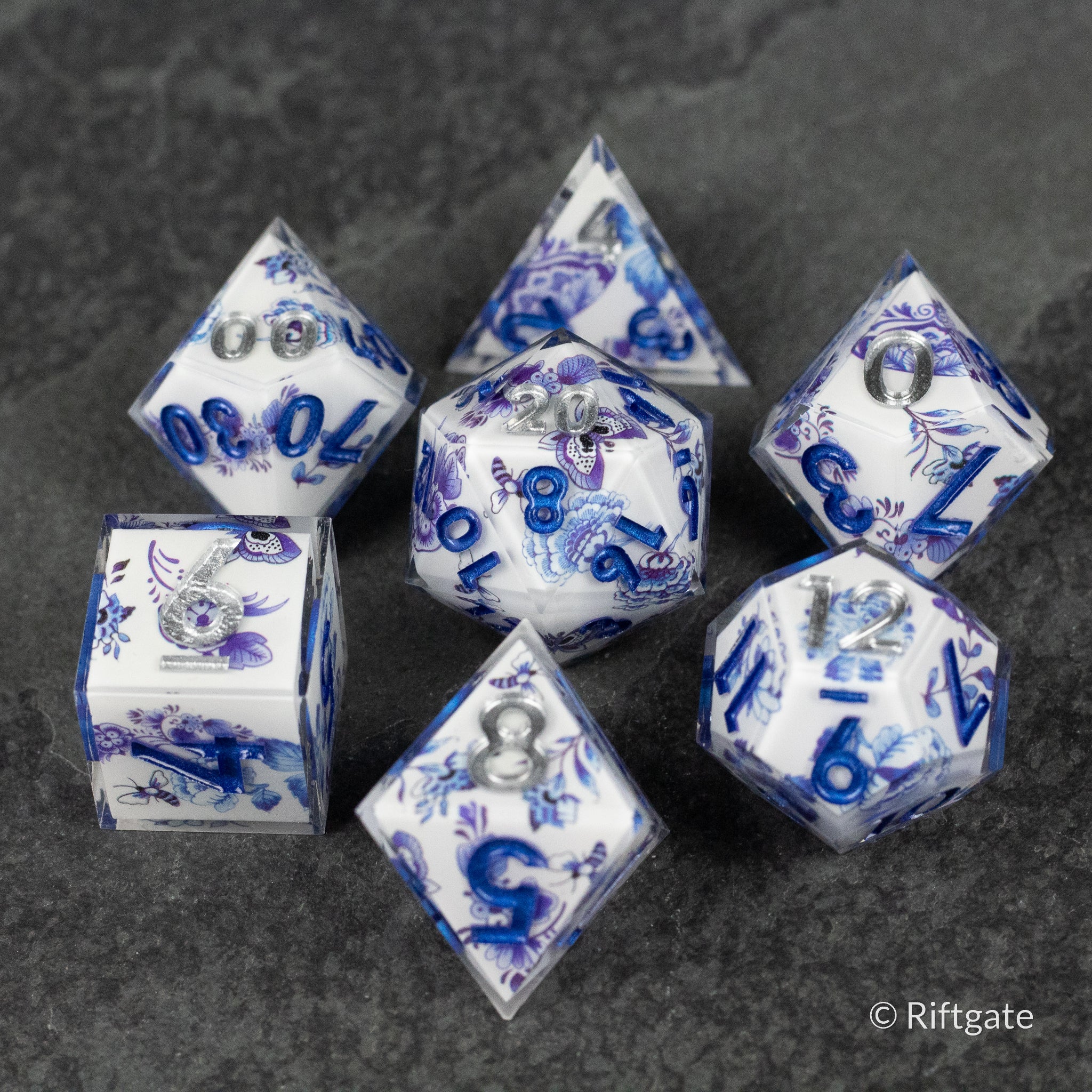 - Sharp edged RPG dice with white backdrop and blue flowers, bees, and butterflies