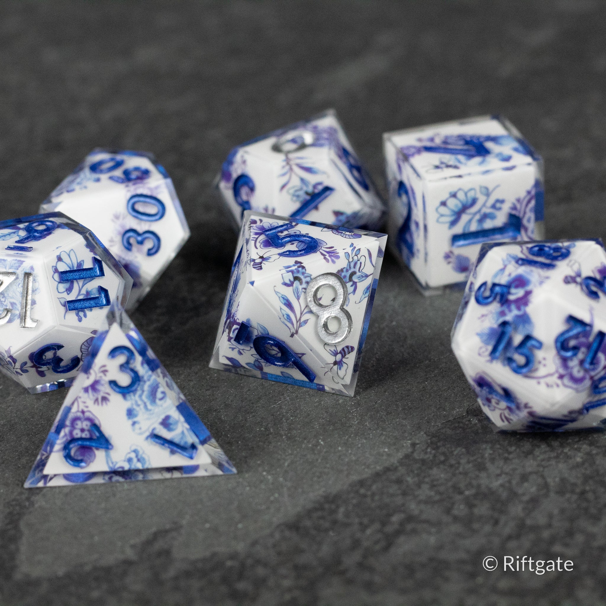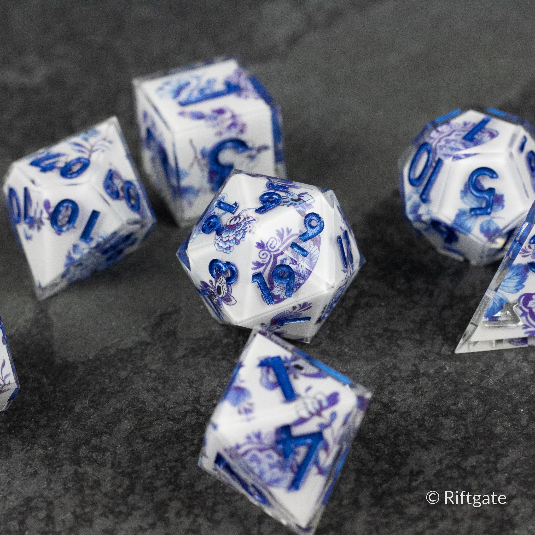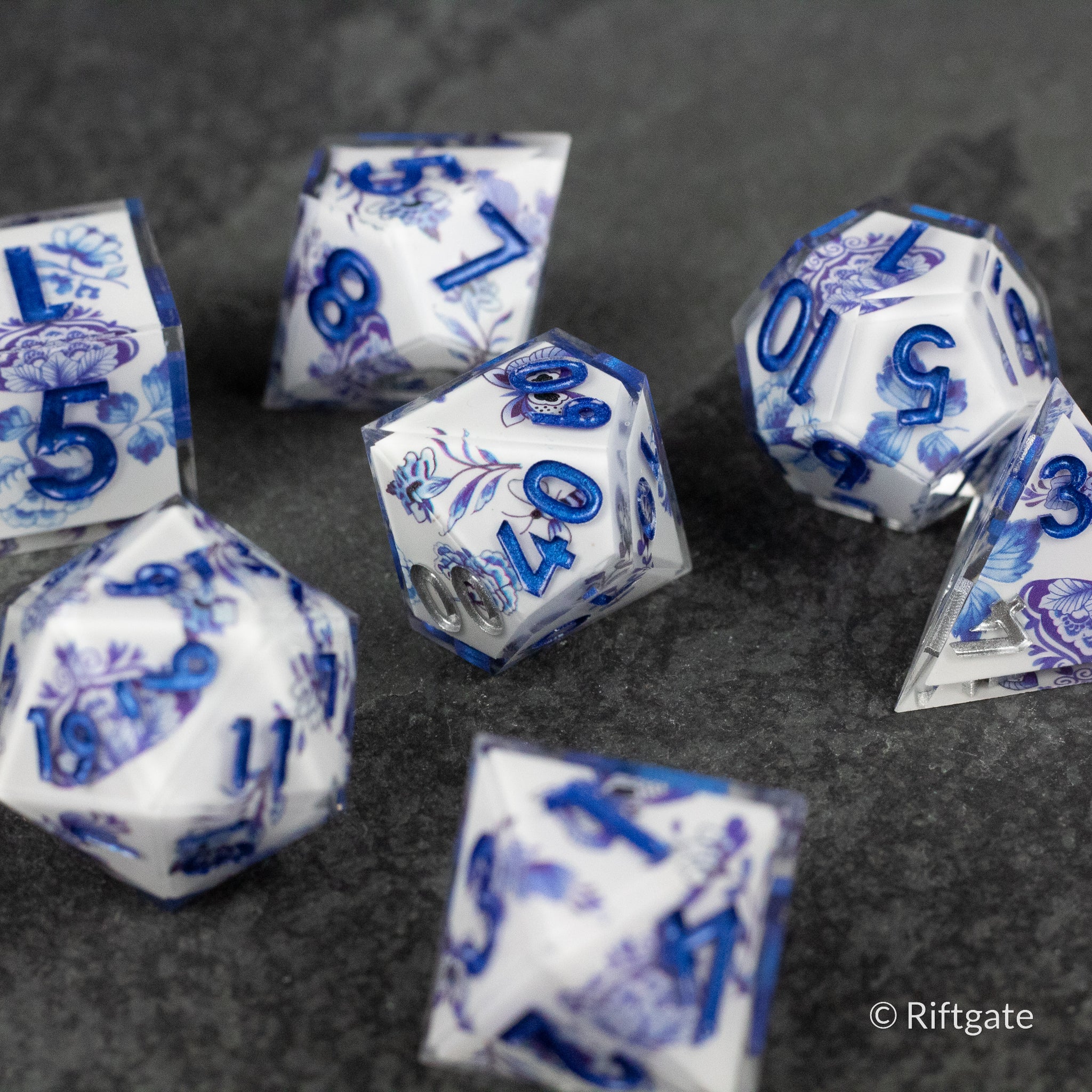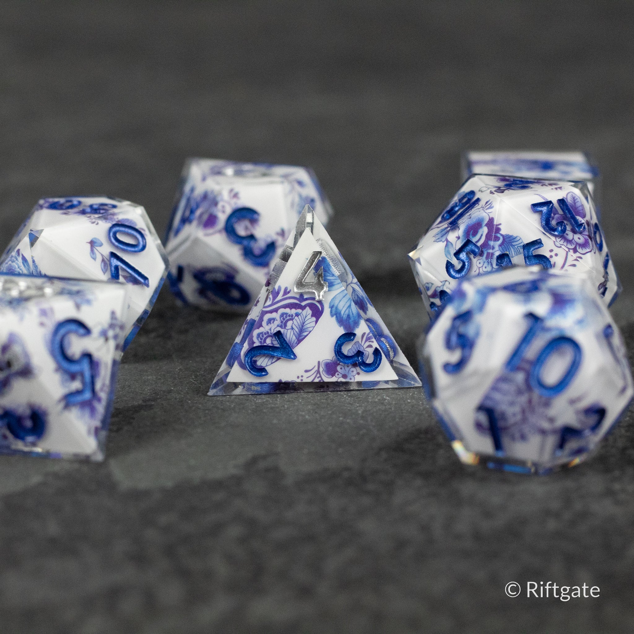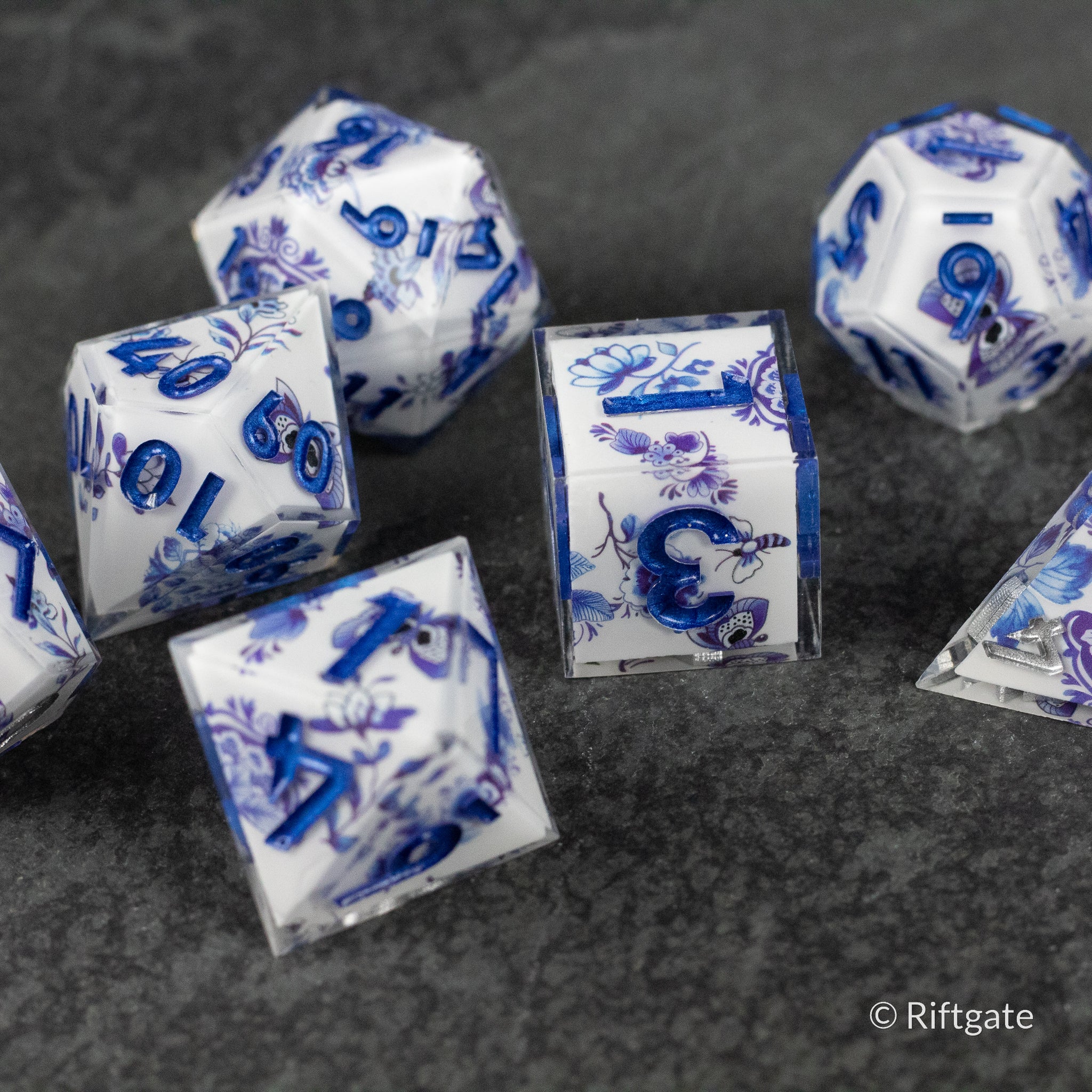 - Sharp edged RPG dice with white backdrop and blue flowers, bees, and butterflies