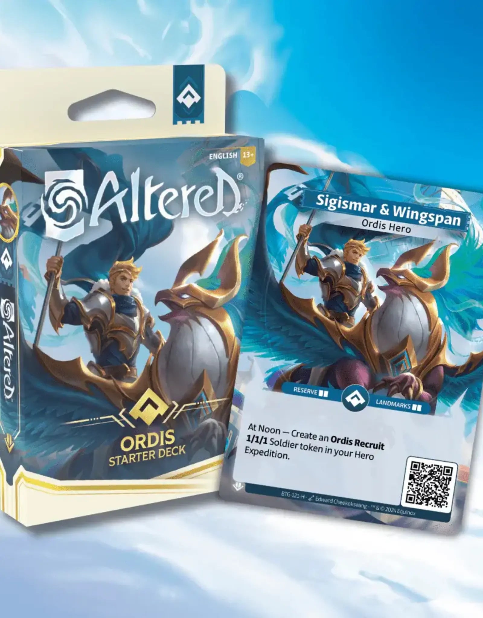 Lead your expeditions Beyond the Gates in this first core set for Altered, a brand new and innovative trading card game. As one of the Heroes of your Faction, you and your Companion have been sent to discover and bring balance to the nearby regions altered by magical winds. Reunite your Hero and your Companion anywhere on the adventure map to win the game! Play your first game and learn the rules with these Altered Starter Decks, containing everything you need to play Altered. Starter Decks are perfect for new players: shuffle your cards and you can play with them right away! They contain 40 cards (39 cards + 1 Hero), a rule leaflet, a foldable playmat with the game zones, the 5 Adventure cards 2 Reminder cards, 1 Foiler card and some markers as well! Once you feel like you know your deck, customize it with Rare and Unique cards from booster packs! Dont forget to scan your cards: adding your cards to your digital collection is needed to unlock all of the digital features Altered has to offer.
