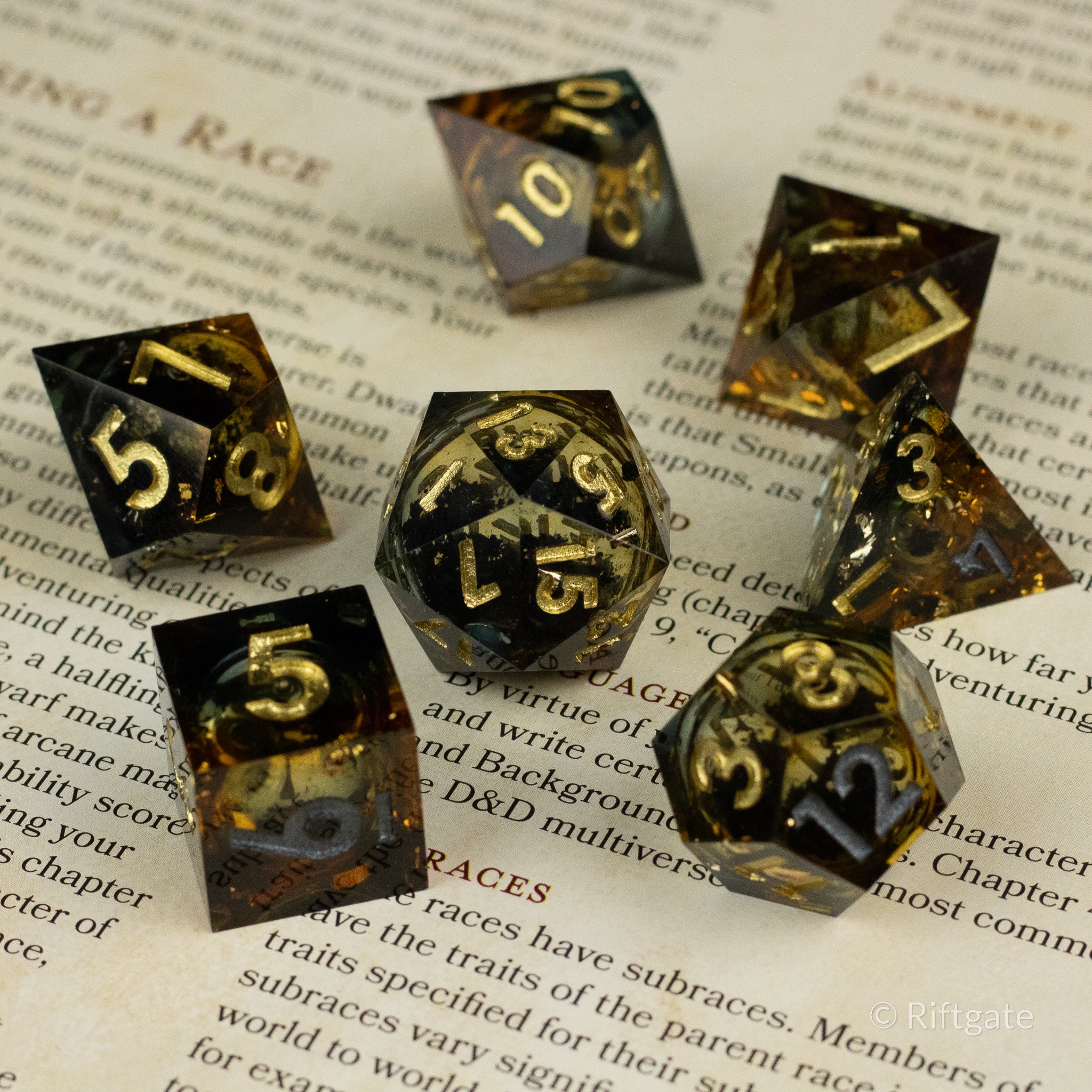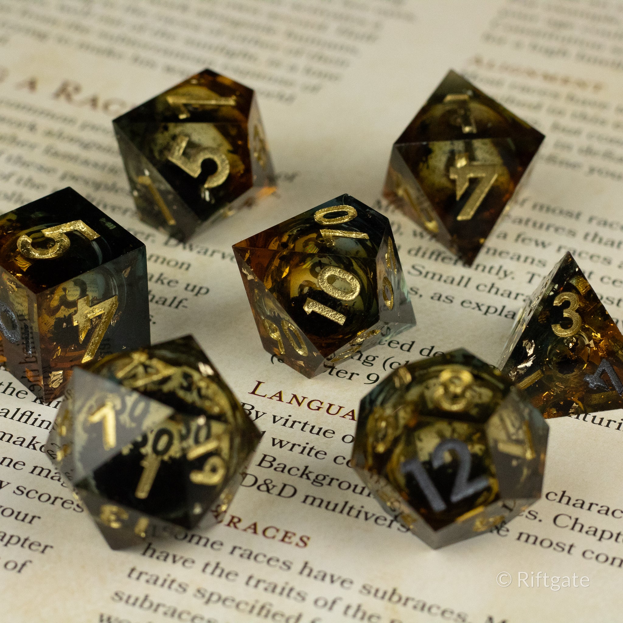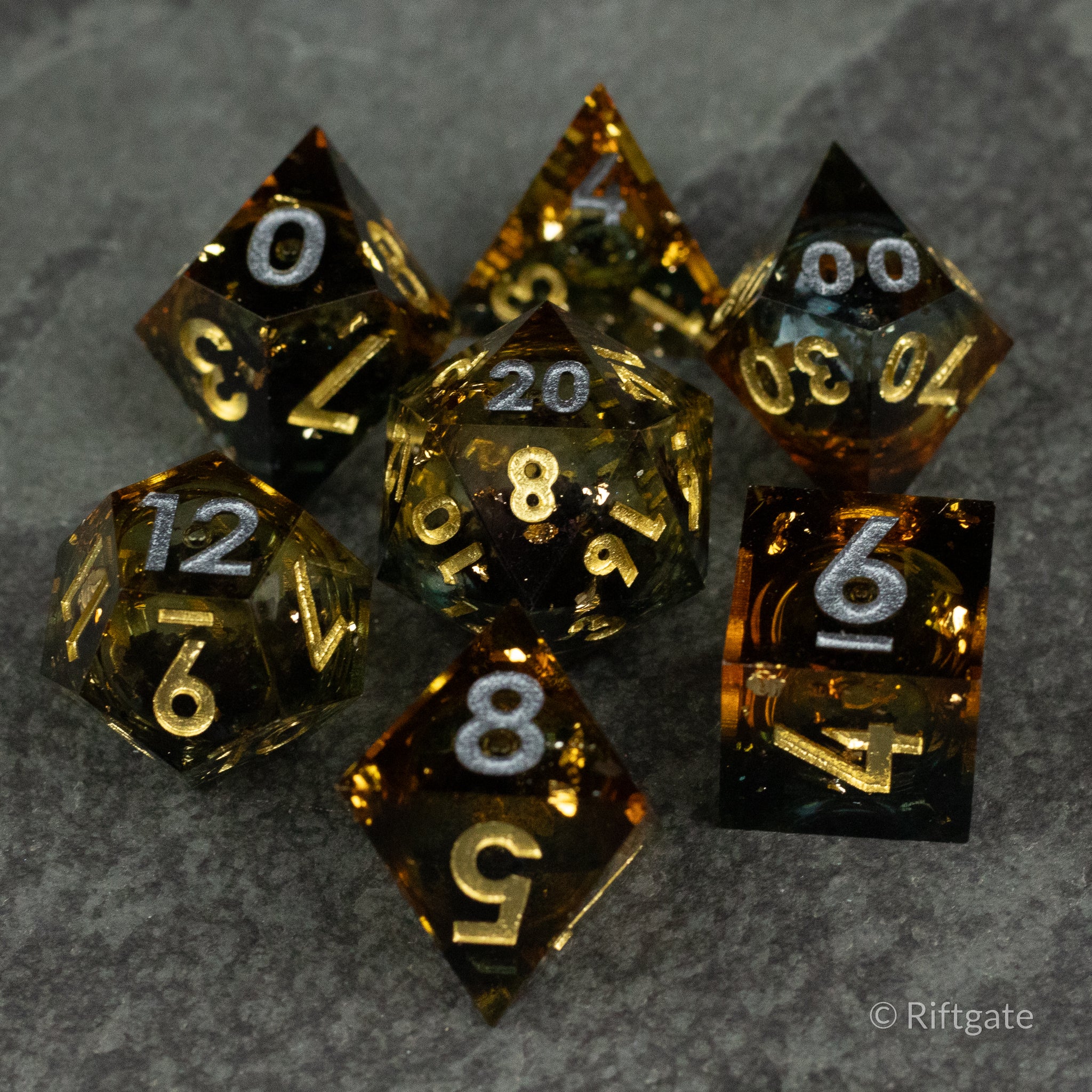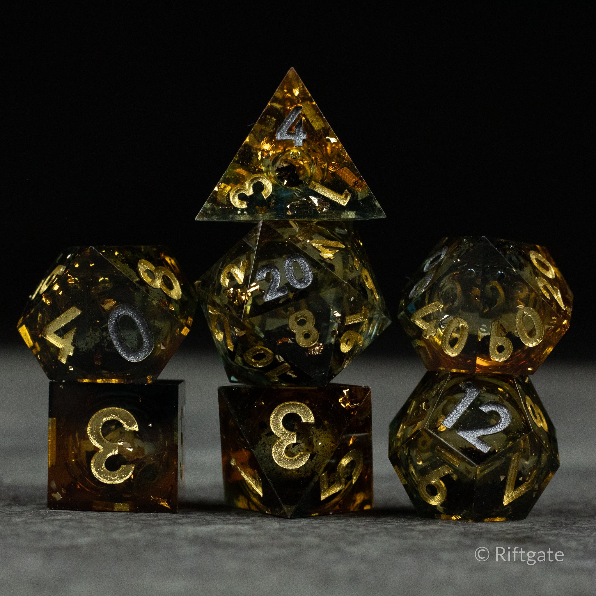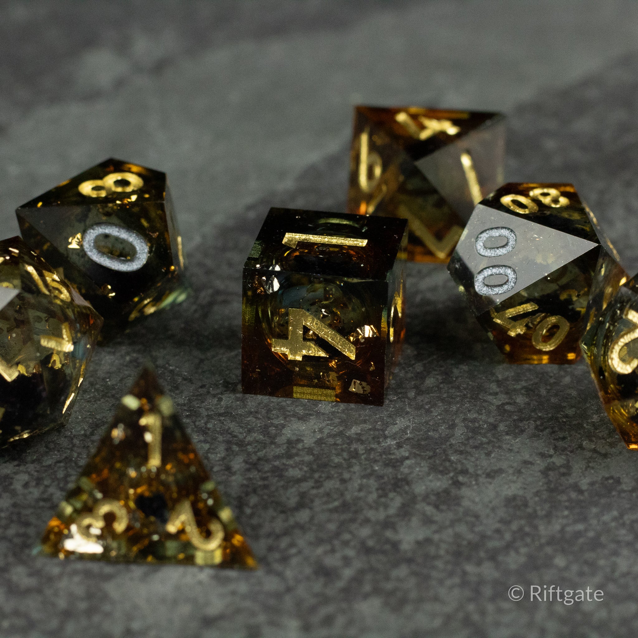 The Ambershadow Elixer is a liquid core dice set with an amber and black resin that contains a liquid core of black glitter. Gold is used for the numbers save for the highest number of each die, which is contrasted in dark gray.