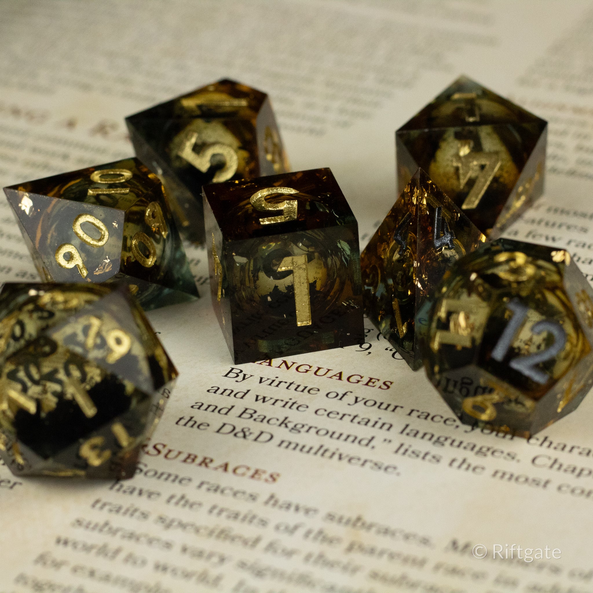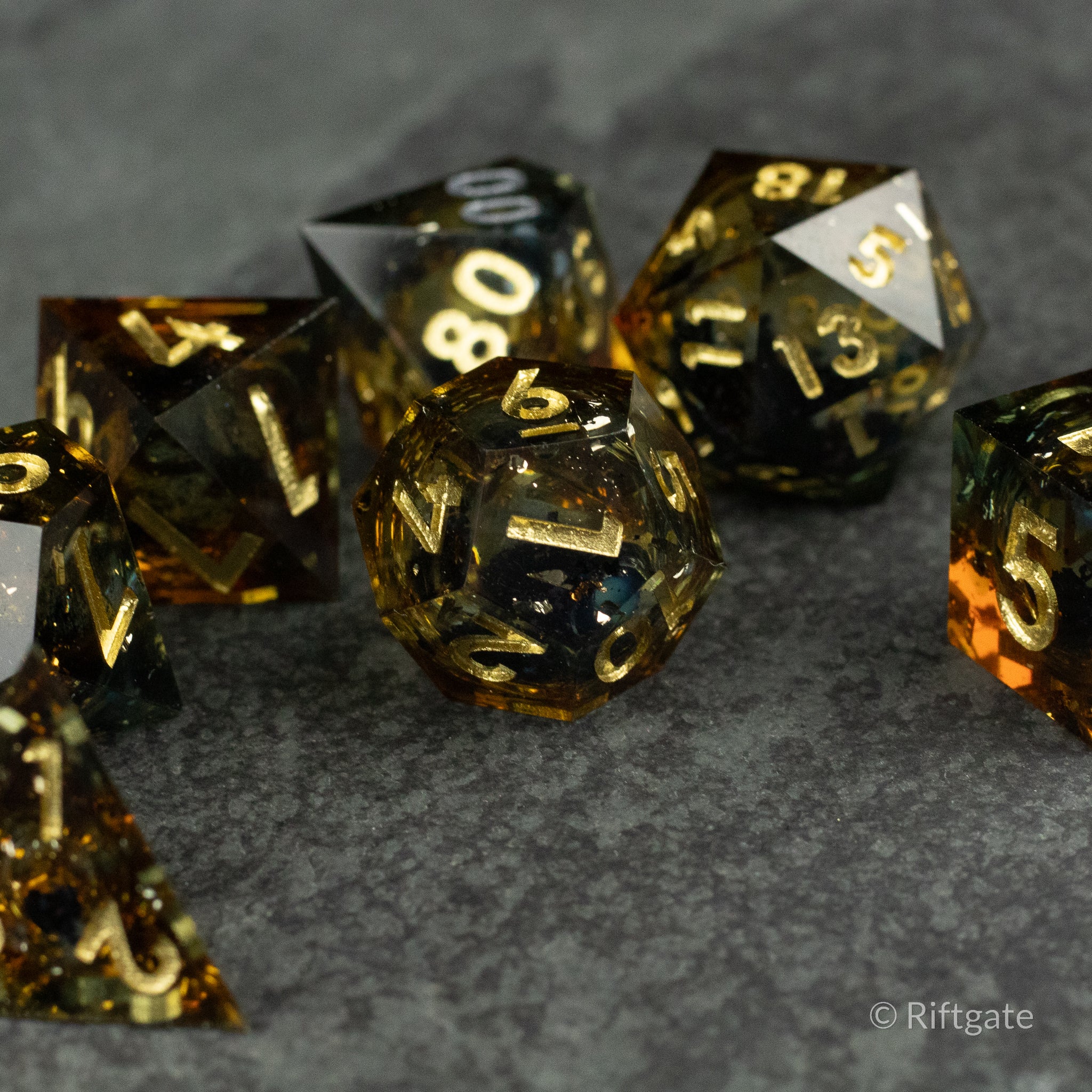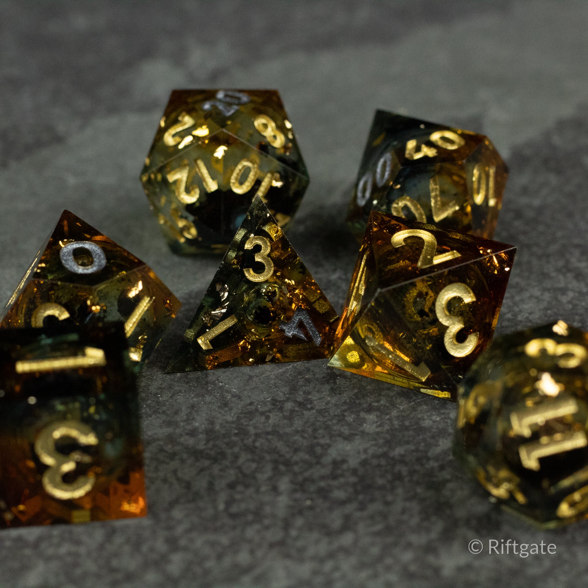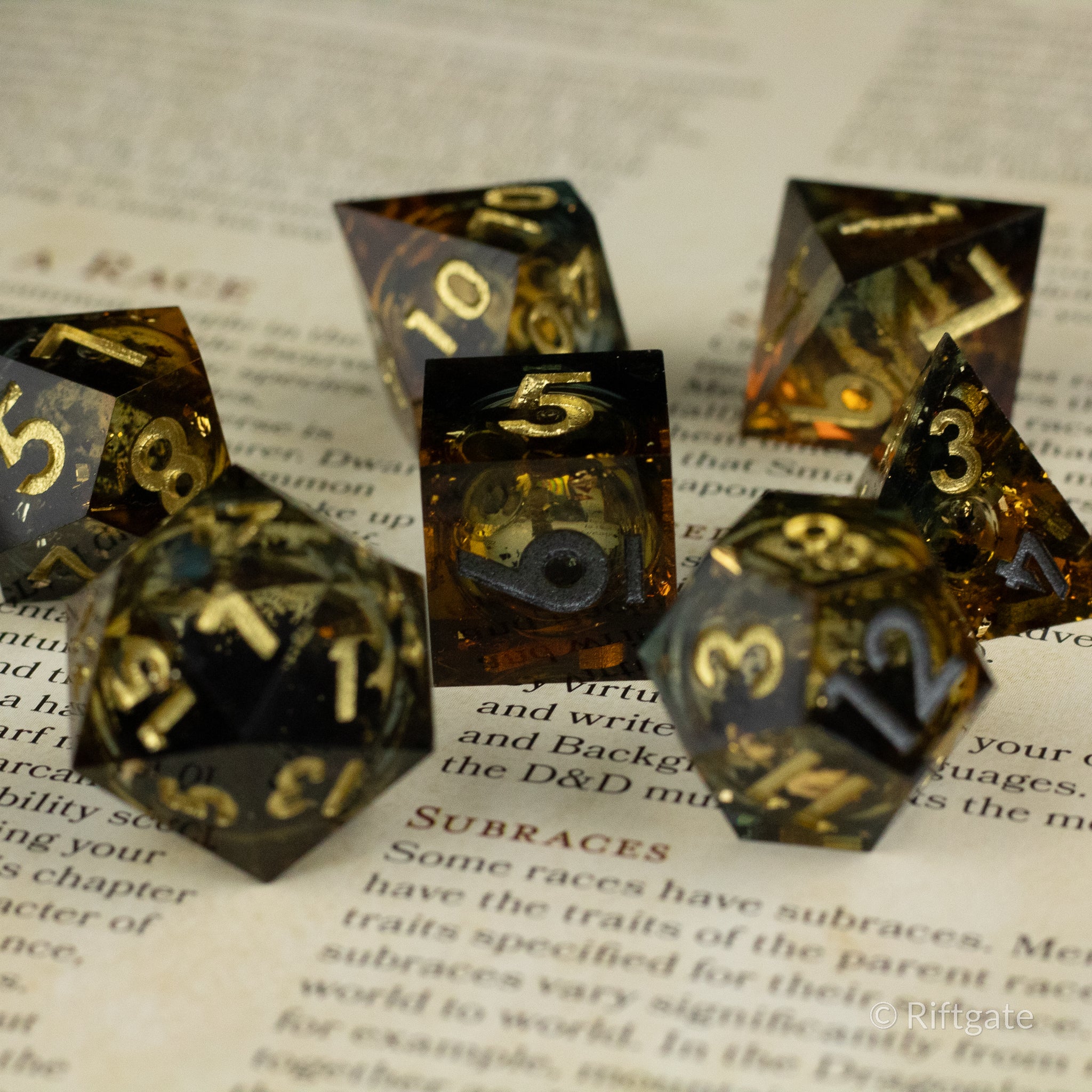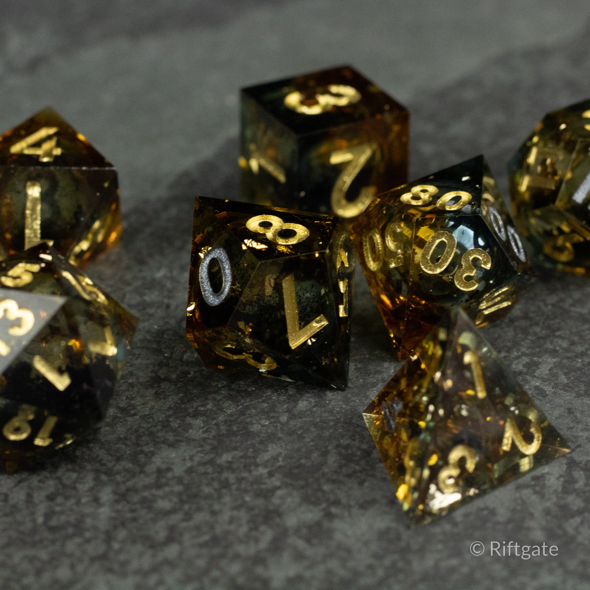 The Ambershadow Elixer is a liquid core dice set with an amber and black resin that contains a liquid core of black glitter. Gold is used for the numbers save for the highest number of each die, which is contrasted in dark gray.