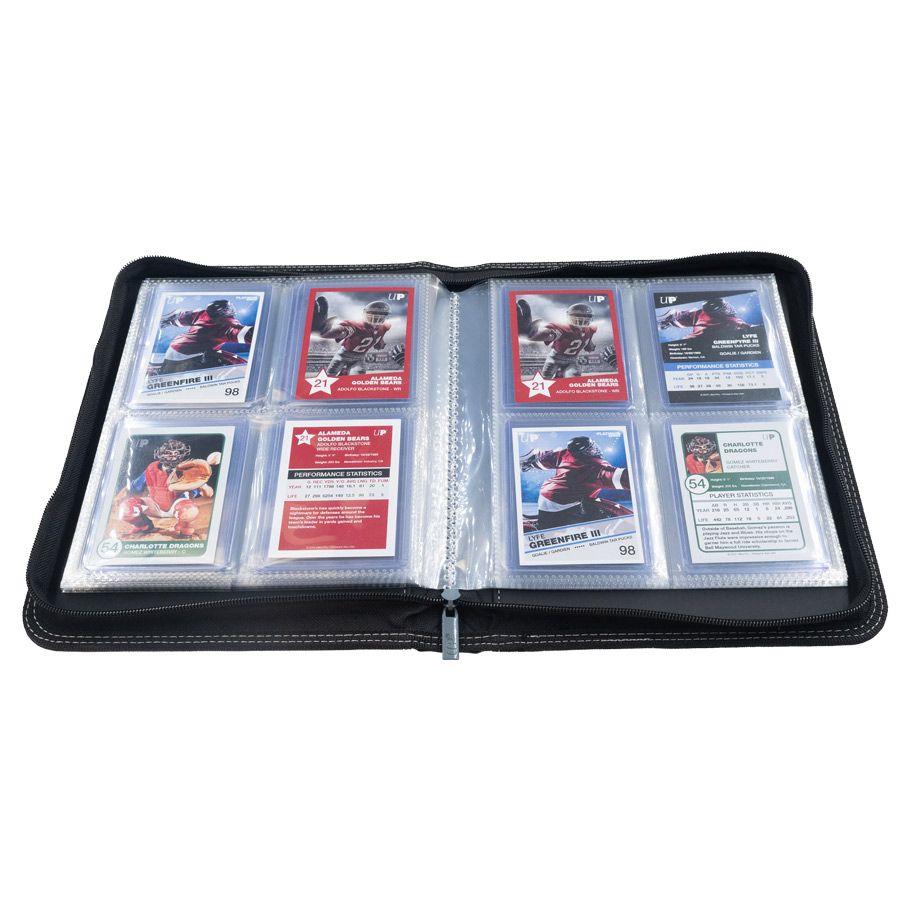The 4-Pocket Toploader Zippered Premium PRO-Binders are ideal for keeping your sports card collection organized and safe inside of Penny Sleeves & Toploaders. These PRO-Binders feature clear archival safe 4-pocket pages with side loading pockets to keep Toploaders in place and your collection clean and protected. They also feature a padded leatherette cover with a matching zipper closure and pull tab. The album has 20 pages that hold up to 80 standard size cards in standard Toploaders, allowing to easily view the front and back of your cards. (cards & Toploaders not included).