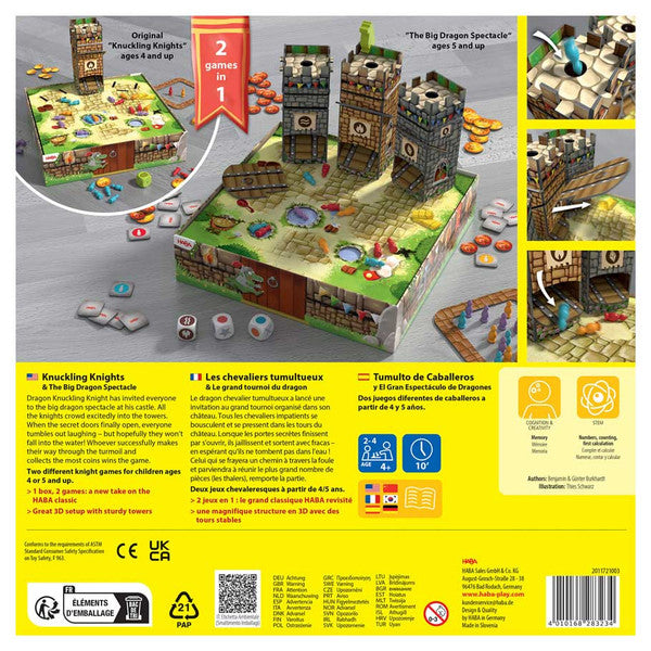 Knuckling Knights has been in play since 2004, this brand-new edition adds the Great Dragon Spectacle, a new game with more towers and more complex gameplay for kids 5 years and older.