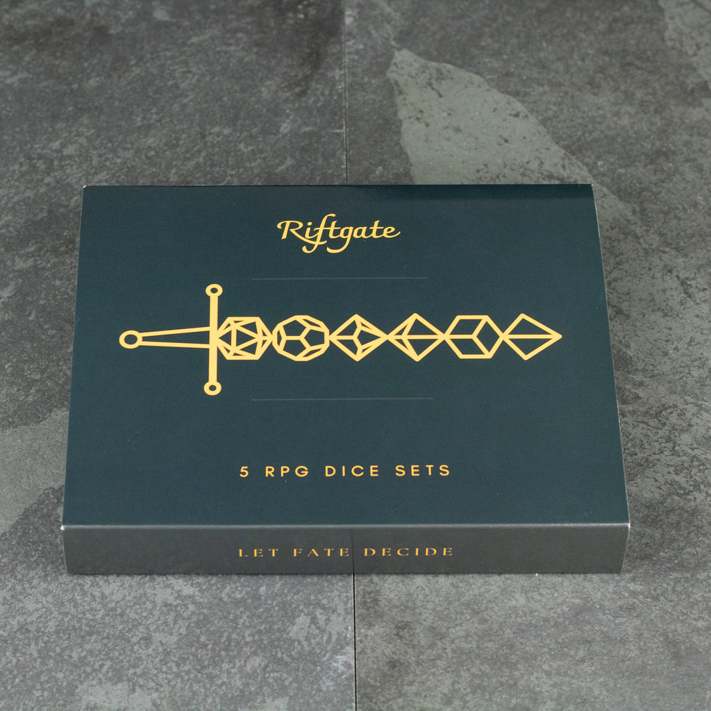The sturdy paper box is embossed with a gold D20. Felt lining keeps the dice securely and safely in place. The box comes with a protective outer sleeve with a dice sword design.