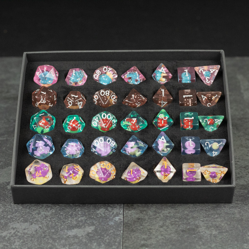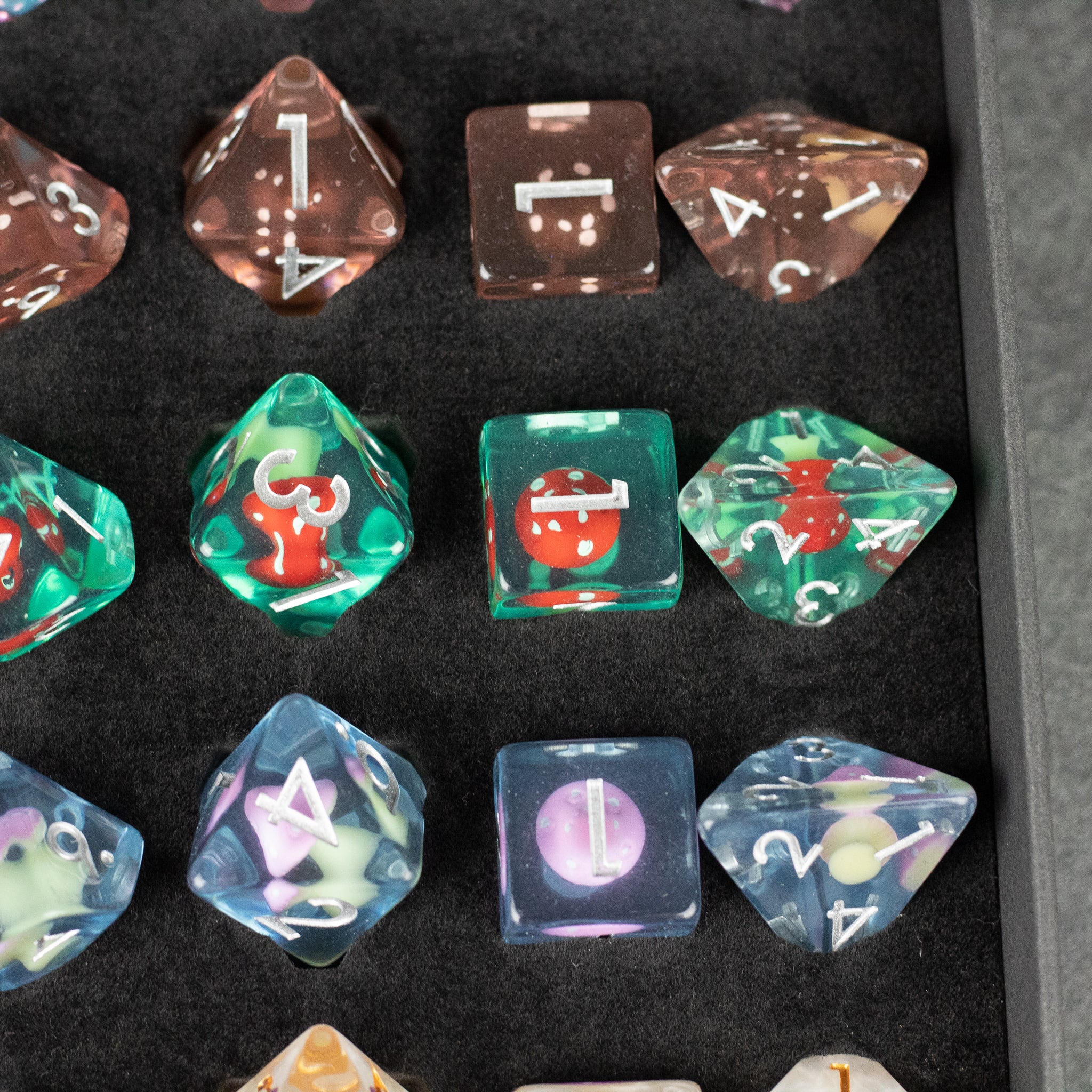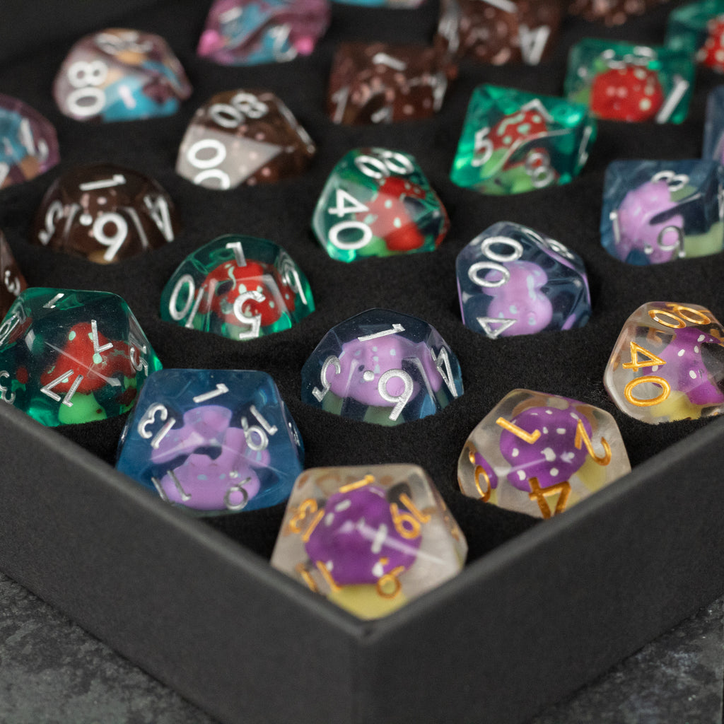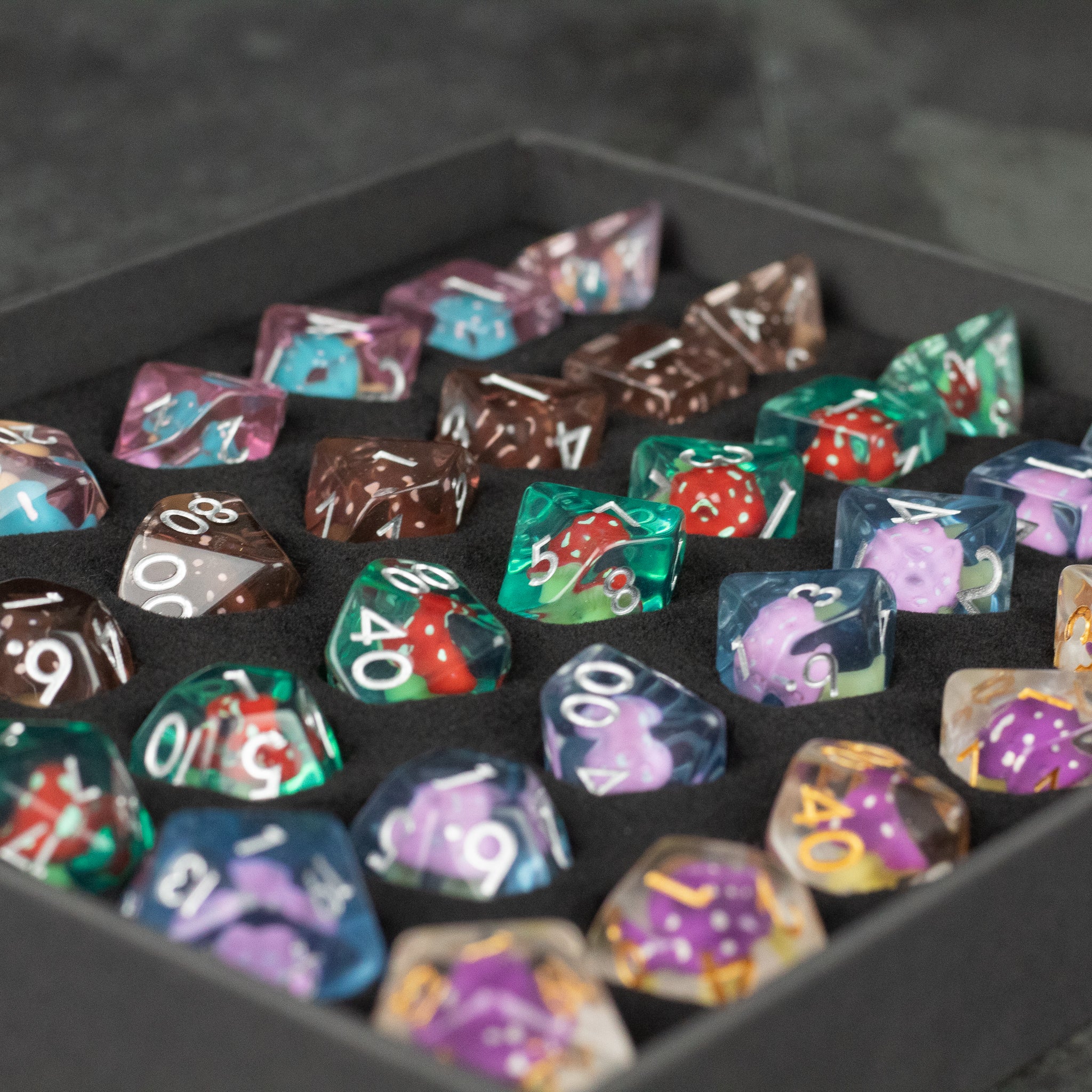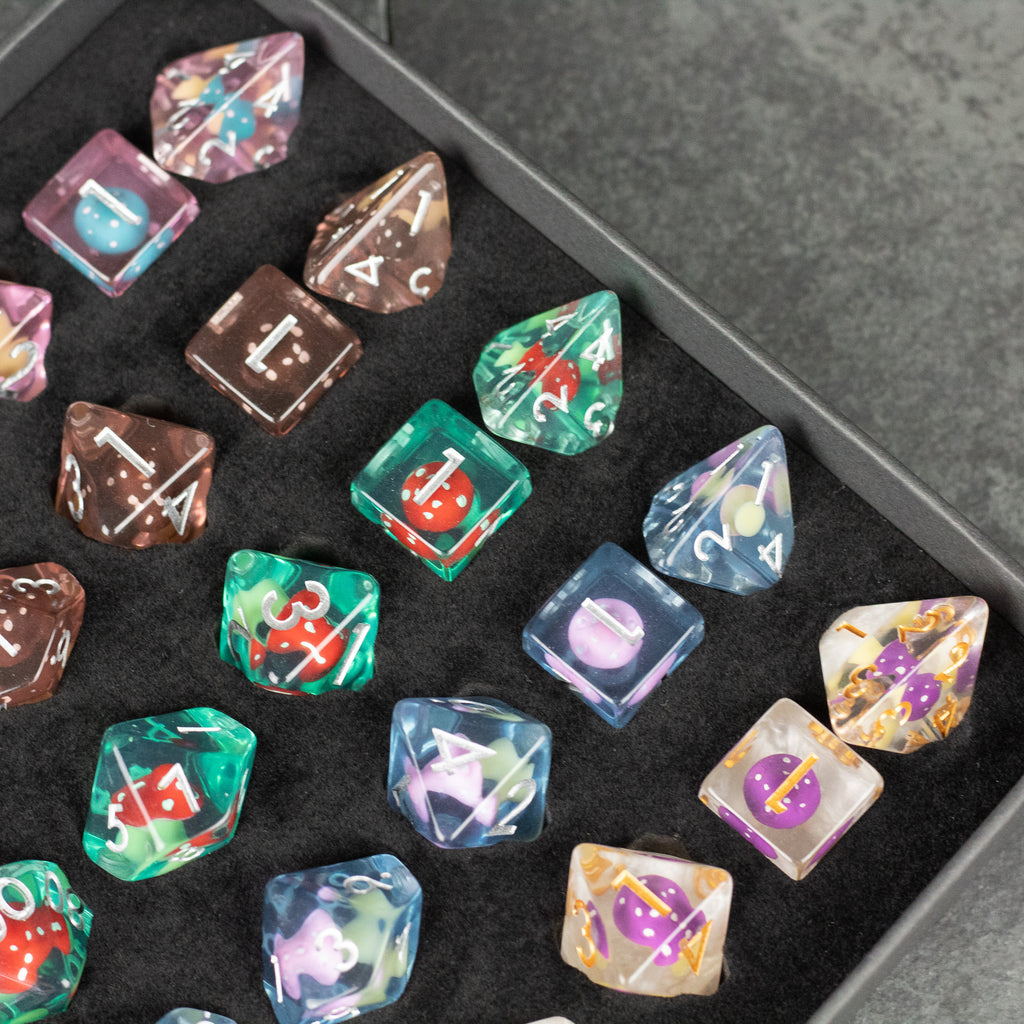 This Mushroom DnD Dice Gift Box includes 5 sets of resin RPG dice, each with a tiny mushroom inside. Varieties will be as pictured.