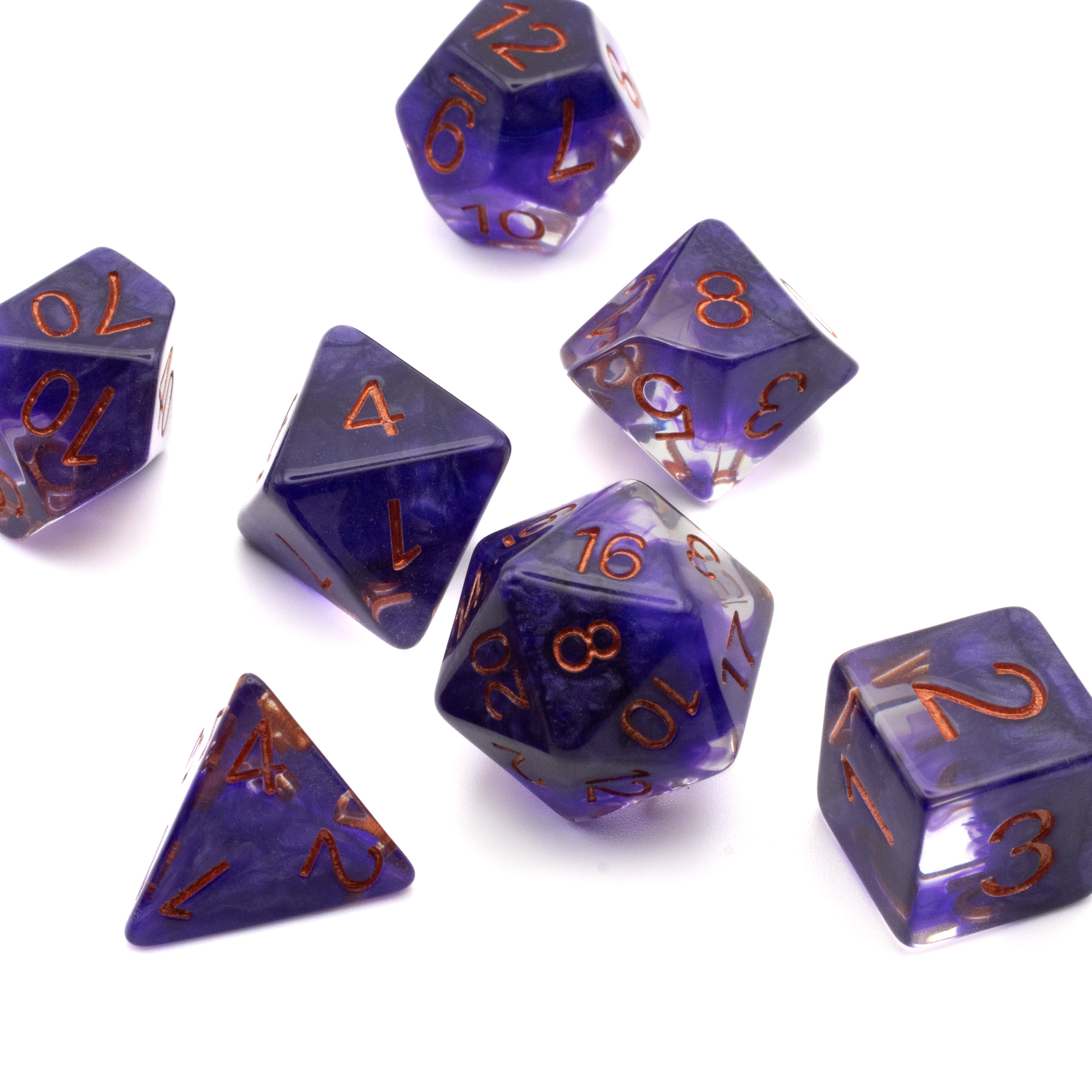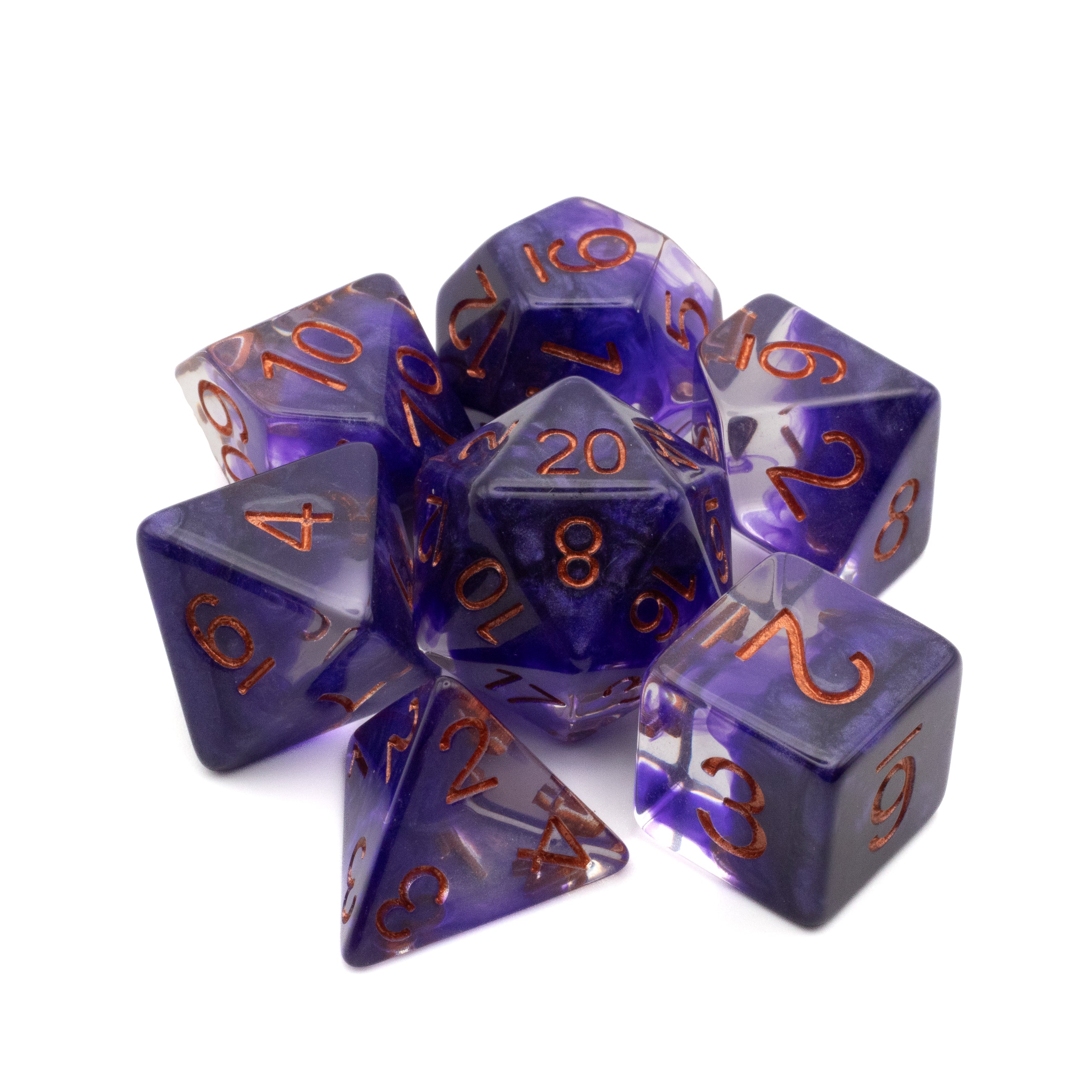 The Purple Fog Cloud DnD Dice Set features a half transparent and half opaque design, like a heavy wall of fog! Ideal for TTRPGs like Dungeons and Dragons or Pathfinder. These dice feature rounded edges.