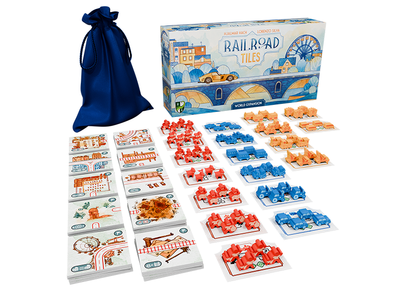 An expansion pack for Railroad Tiles, a sequel to the roll-and-write series Railroad Ink, is a quick-playing tile placement game in which you pick tiles and place routes to build an interconnected community. Add a variety of cars, trains, and travelers to your transportation network!