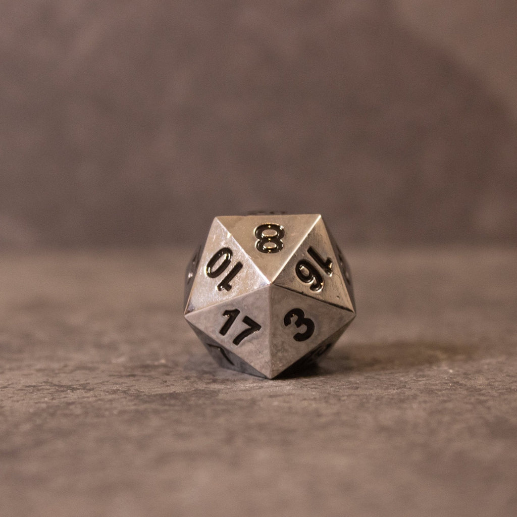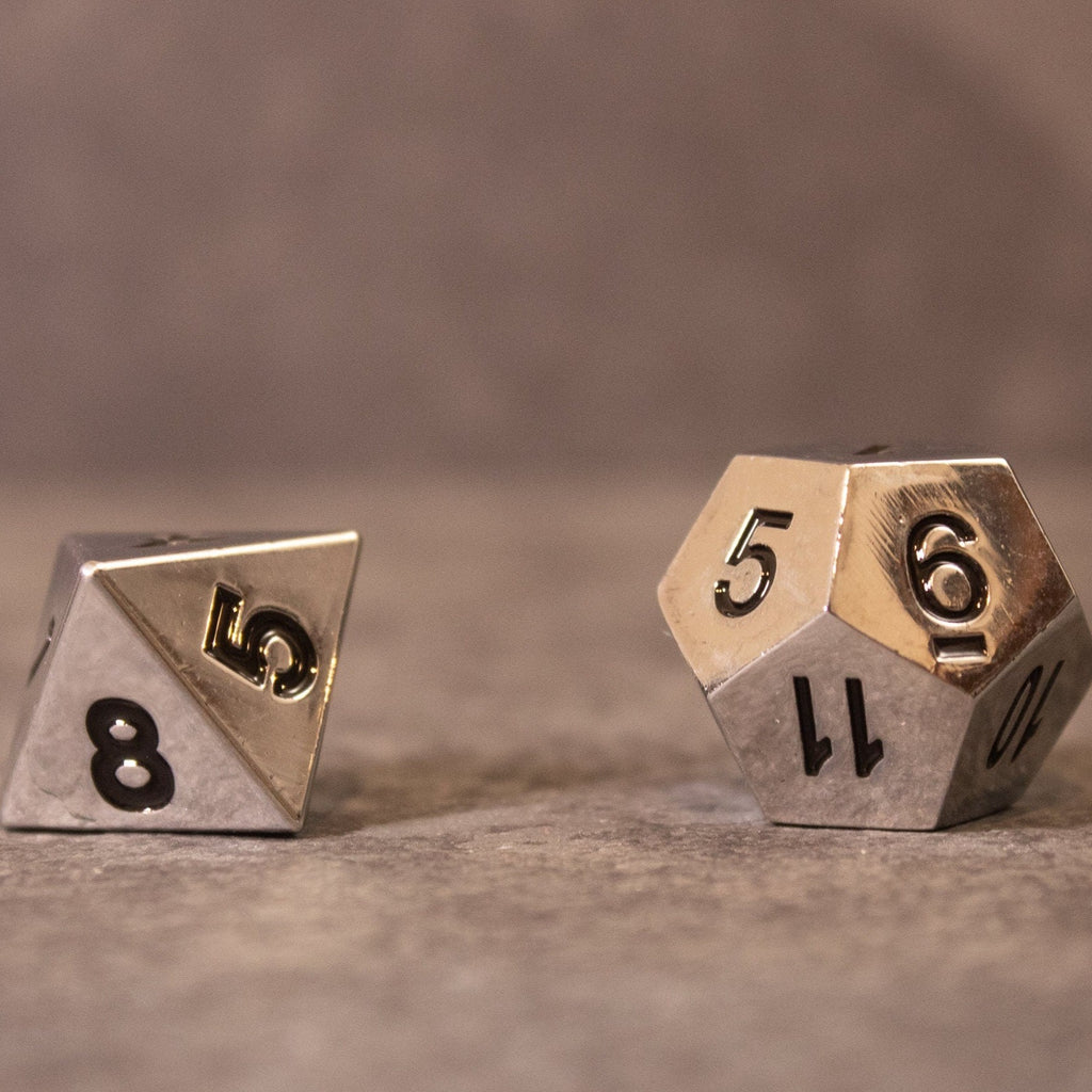 Silver polyhedral metal dice for a clean, mirror-like look.