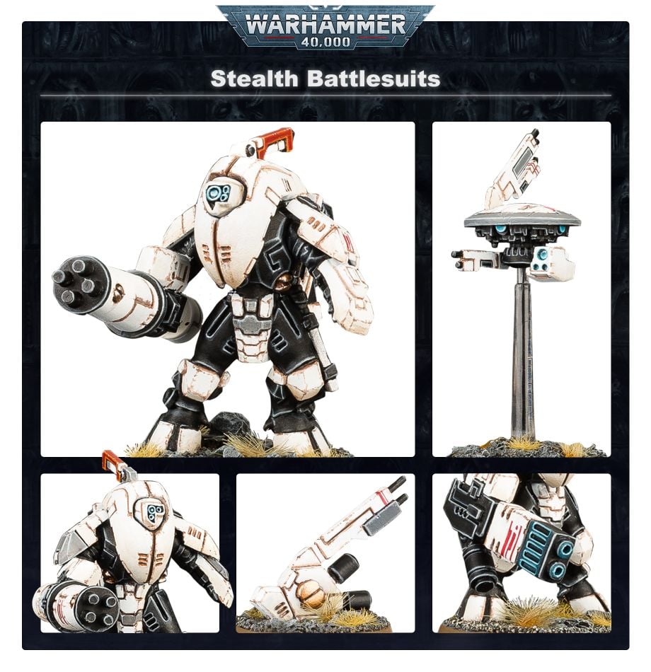 Stealth Battlesuits are relatively lightweight and specialised to their role within the T'au Empire's Hunter Cadres. Instead of simply protecting their pilot with layers of armour, they conceal them behind fields of sensor-baffling stealth technology. Benefiting from jet-assisted speed and impressive firepower, teams of these scouts make excellent forward operatives who can deploy homing beacons to guide entire insertion forces into battle from low orbit.