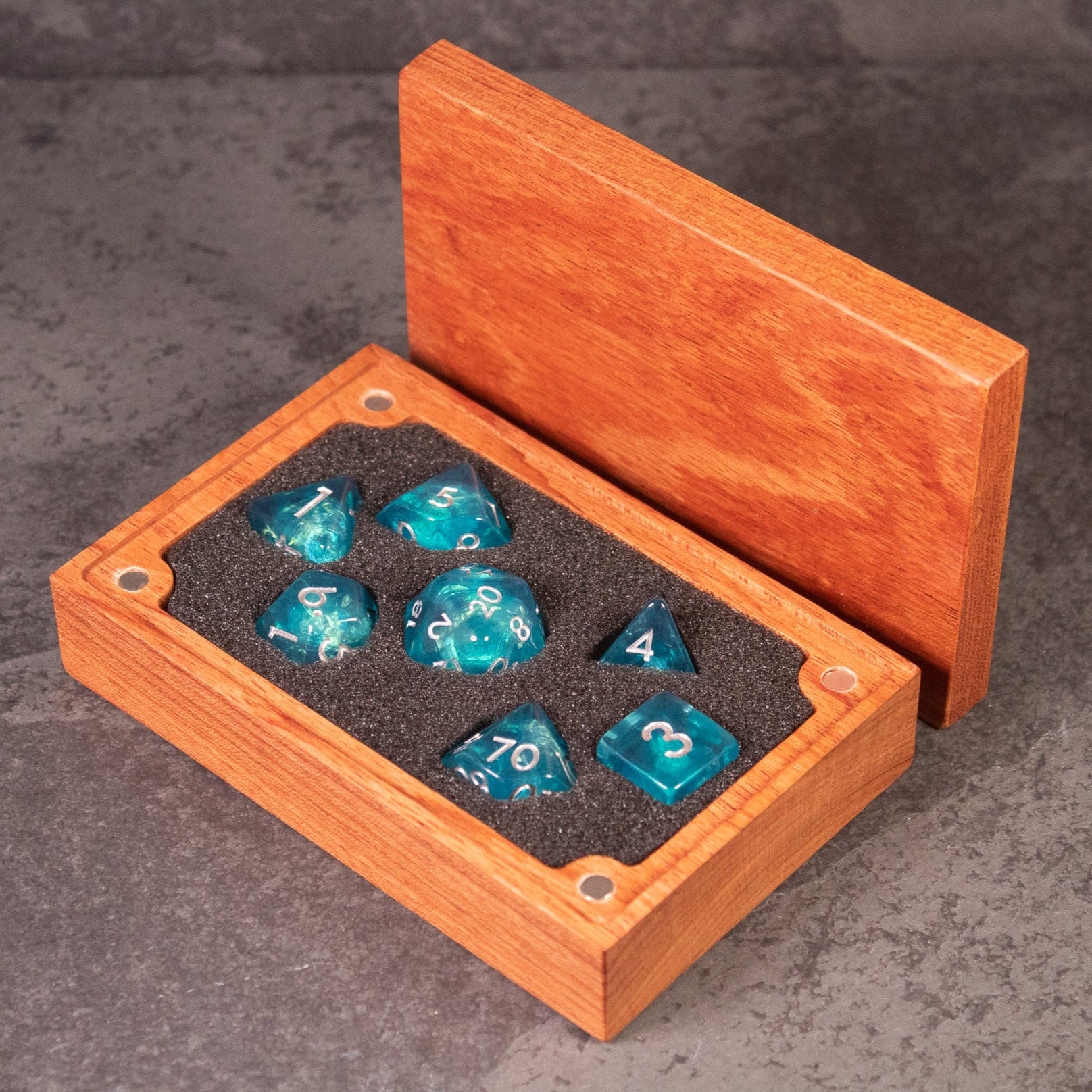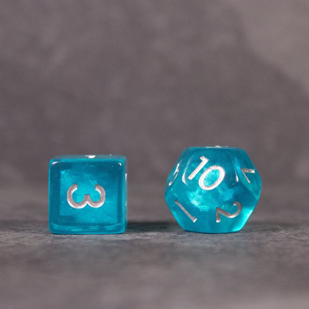 Polyhedral dice with a teal-blue color. Dice feature rounded edges and shimmery inclusions.